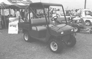"The combination of the oscillating chassis and lugged tires keep it going where even 4-WD vehicles such as the Kawasaki Mule would get stuck," says Bill Hensley, sales manager. "We went to Mule customers and asked them how their vehicles could be improved, then incorporated their ideas into the Hawk. For example, we moved the gear shift lever and parking brake to a center console so the driver doesn't have to reach forward to use them. A steel plate under the engine protects it from rocks and mud and there's a `sunroof' on the overhead canopy. The headlights are recessed so they can't be knocked off. Seat belts, rack and pinion steering, and rear wheel hydraulic disc brakes are standard equipment. A hydraulic-operated dump body is available as well as an optional solid poly box that's easy to clean and won't leak or rust. We also offer a weather-tight, molded 1-piece cab complete with windshield wiper.