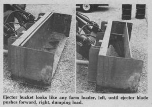 Invented by Bruce Johnson, Raleigh, N.C., the ejector bucket ù called the Doz-A-Loader ù picks up its load like any other bucket loader. But to dump, you simply activate a cylinder that pushes the load out the front.