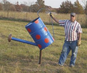 Giant Watering Can FARM HOME Miscellaneous My husband Charles made this giant watering can that sets in a small field where I like to grow wildflowers It s built from a 55-gal barrel that s painted Ford blue with Allis Chalmers orange polka dots Charles also made 12 to 15-ft tall flowers by welding old 4-ft dia wheel rake heads to lengths of pipe set in concrete One of the flowers is double headed We painted the rake wheels bright yellow except for copper in the center portion Barbara Kribbs 18230 N Hwy 124 Centralia Mo 65240 ph 573 682-3980 or 573 819-9027; cbkribbs@centurytel net