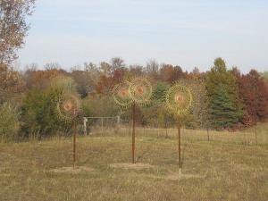 My husband Charles made this giant "watering can" that sets in a small field where I like to grow wildflowers. It's built from a 55-gal. barrel that's painted Ford blue, with Allis Chalmers orange polka dots. Charles also made 12 to 15-ft. tall flowers by welding old 4-ft. dia. wheel rake heads to lengths of pipe set in concrete. One of the flowers is double headed. We painted the rake wheels bright yellow, except for copper in the center portion. (Barbara Kribbs, 18230 N. Hwy. 124, Centralia, Mo. 65240, ph 573 682-3980 or 573 819-9027; cbkribbs@centurytel.net)