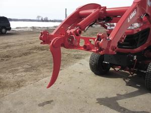 Dunn has designed a 16-in. ripper tooth for the receiver hitch. With its range of movement and down pressure, the tooth is ideal for loosening soil, digging roots or popping rocks out of the ground. He also has a set of fixed forks for use with pallets.