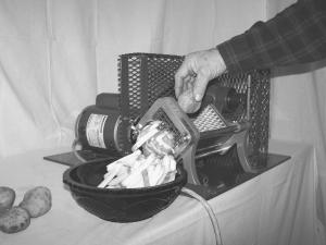 It’s simple to operate: drop in one potato at a time, and move the potato pusher head by stepping on a foot pedal. The Potato Master is powered by a 1/4 hp motor and gearbox that will cut 300 to 800 lbs. of potatoes an hour.