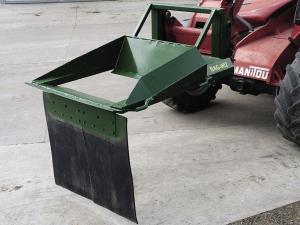 Strawson adapted the stationary system to use on a loader. The Bagwiz lets one person fill more bags faster. The loader-mounted hopper is driven into the load of firewood or other material. A heavy-duty rubber flap protects the bag. The operator then “flips” the Bagwiz back to toss material into the bag until it’s full. The loader is then driven to a loading area and the full bag is replaced with an empty one.
