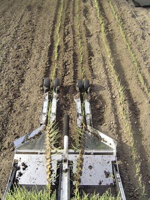 “The transplanter works best in a flat, uniform, tilled bed and generally best in lighter soils,” says Hendrickson. “Heavier soils may require using a rake to cover the pot with soil.”