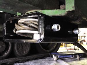 A 1 1/4-in. dia. steel cable hangs on a bracket at the front of the tractor. It runs back under the tractor to a heavy 2 3/4-in. dia. pin with a cable pulley that’s housed inside a heavy metal bracket bolted onto the tractor’s frame. To pull out the stuck tractor, you hook up to the cable on front.