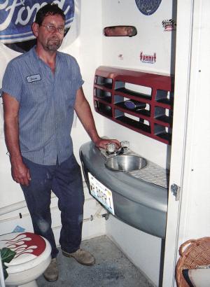 Ford Parts Used To Create Man s Bathroom FARM HOME Bathroom The sign by the door says “Office” but the half moon in the frosted glass of the storm door is the real indication of what’s inside Auto mechanic and Ford fanatic Dave Rakers took his work and sense of humor home when he created his “Man’s Bathroom” complete with a bumper and grill off an early 1990’s Ford F-150 pickup “My wife said I could do whatever I wanted with it ” he says of his space in the couple’s laundry/mud room “I had limited space so I couldn’t put in a regular sink ” He made the best of the narrow area by installing a stainless steel bowl on a bumper attached to the wall on brackets he built and lag screwed into the wall studs He cut a hole in the bowl and hooked up a drain The grill over the sink adds to the ambience and serves as a shelf A rear view mirror adds the final touch amid auto decals and signs decorating the walls Rakers had all the auto parts and only had to purchase the faucets and plumbing parts to complete the bathroom “I used my father-in-law’s old license plates to make my wife happy ” Rakers says Contact: FARM SHOW Followup Dave Rakers 107 Main St Ohlman Ill 62076 ph 217 622-4918