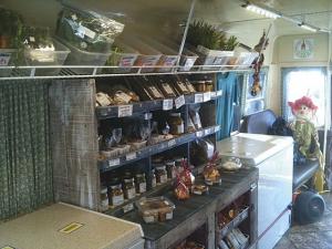 Customers enter at the front, pick up their items and exit the back. “The best feature of this bus is the temperature control,” Paulette says. “We can keep our food products cool or frozen. The air conditioning keeps us cool in summer and the heat keeps us warm in the winter.”