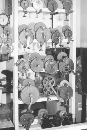 The trailer contains about 80 different hand-cranked bench grinders built from the late 1800’s up to the 1950’s, some of them quite rare. The grinders are designed to bolt onto a bench and were used to sharpen everything from kitchen knives to shop tools. Some models were designed to sharpen scythes and hand sickles. A few industrial models were designed for use in factories.