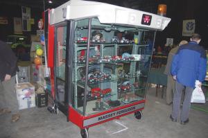 A model toy maker found an innovative way to display his collection of Massey Ferguson toys by mounting an MF combine cab on wheels and fitting it with display shelves. The big windows make the toys easy to view but keep people from handling or walking off with them. One other benefit is that you can match the model of cab to the brand of toys on display.