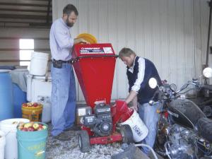 When Miller grinds apples he idles the shredder at a very low speed and runs the discharge chute into a clean 5-gal. pail. “The shredded apple pulp and juice fill the pail quickly, so this is definitely a two-person operation,” Miller says. Eight buckets of whole apples will make five buckets of pulp in just 10 min.
