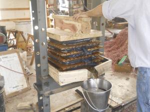 Miller’s press racks are slightly smaller than the box, made from oak or ash wooden laths. To prepare for pressing, a 3-in. layer of ground pulp is wrapped in fabric and placed on top of each rack. He stacks five racks on top of each other in the box, with a solid cover on top.