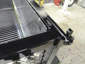 The 12-in. high, bolt-on box extension consists of a frame made from welded-together 1-in. sq. tubing, with aluminum diamond-plate filler panels pop riveted onto it. The tailgate hinges at the top via a pair of welded-on steel pins that fit into slots. A center-mounted, angle iron bracket at the bottom of the tailgate latches on behind the Gator’s tailgate to keep the box shut. Once the tailgate is latched, round tabs at the bottom corners of the tailgate keep it from accidentally rising upward and slipping out of the slots. The tabs slip under square tubing “stops” welded onto the corners of the frame.