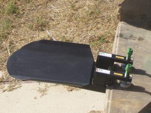 The planter rides on a 4-wheeled truck dolly with three 1-in. dia. metal pipes attached to it at an angle. The pipes are spaced 8 in. apart. A cultivator shank is clamped to the bottom of each pipe while the upper end extends a short distance into the mailbox. He made seed tube “stoppers” out of a set of three 4-in. long, 1/2-in. dia. pvc pipes mounted on a crosspipe with a center-mounted handle. All the pipes have fittings on them that fit snugly into the seed tubes.