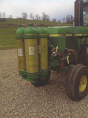 “We have natural gas fumigation systems on a pickup and on our Deere 2-WD and 4-WD diesel tractors, and they work great,” says Warsaw, Ohio, farmer Ed Jones. “Burning natural gas with diesel boosts horsepower by about 30 percent, helps the engines run cleaner and saves us money on fuel.” They have natural gas wells on their farm so the product is readily available. They capture gas from the line with a compressor that fills tanks on the equipment.