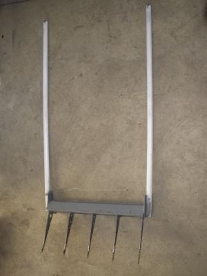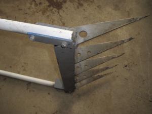 The pipes are bolted to an L-shaped piece of steel welded to the square steel tubing that holds the tines. The lip on the shorter leg of the L wraps partially around the pipe to reinforce it. Seys’ first attempt used lighter weight pipe for handles and 1/2-in. bolts for tines. The bolts were too hard to get into the ground. He switched to 11-in. long, flat steel rectangles that he cut on the diagonal to get sharpened points. While he didn’t need to sharpen them, he did find they bent if they hit a rock.