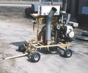 A 10 hp engine that belt-drives 2 different home-built cutting mechanisms, as well as a blower fan, powers the machine. The first cutting mechanism is a chopper and the second a hammermill-type grinder.