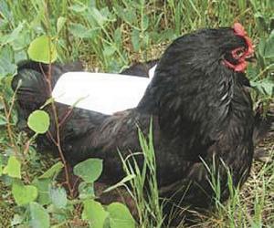 “It protects the hens’ backs from rooster claws and spurs during mating, and if the hen has already been pecked the saddle covers the raw area giving it time to heal. Meanwhile, the rooster can still go about its business,” says Marsz. “Old-style chicken saddles perform a similar function. However, since they’re made of canvas or cloth with elastic straps, they’re not made to last. Moreover, clasps and certain fabric designs attract even more pecking behavior. You can use a permanent marker to draw eye-spots on our vinyl saddle to scare off predators.”