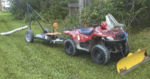 He started with the front axle off an old car and cut it down to a width of 4 ft. so it would trail directly behind the ATV. He used 2-in. sq. tubing to build a 7-ft. high hinged boom that attaches to a frame built on the axle. Cable from a 3,000-lb., 12-volt winch runs through a pulley on top of the boom and raises and lowers the log. Another cable that’s attached to the top of the boom manually adjusts the boom angle. The cable attaches to a short length of chain that drops into a groove on a steel bracket welded to the frame, allowing Thorsen to shorten or lengthen the chain.