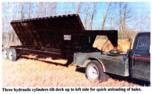 The 24-ft. gooseneck trailer consists of a wooden deck and tandem axles. Three hydraulic cylinders tilt the deck up to the left side. When you're not hauling bales, it can be used as a conventional flatbed trailer.