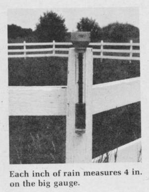 Hauch's new gauge is bigger than almost any other rain gauge at 16 1/2 in. tall. It's designed with an upper funnel-shaped mouth that's 4 times the size of the gauge tube itself so that every inch of rain that falls registers as 4 in. inside the gauge. A strip of orange backing tape on the back of the gauge is magnified as rain fills the tube so that the back of the tube looks solid orange up to the top of the water level, making it easy to read from inside the house or any other remote location.