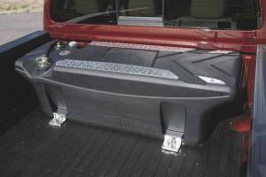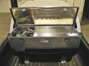 The design of the 60-gal. tank accommodates a variety of needs. It has tie downs to secure a payload hauled behind it, and fits under a Tonneau cover. Titan offers options such as a pump to fill fuel tanks on other equipment or a toolbox that fits over the top of the fuel tank.