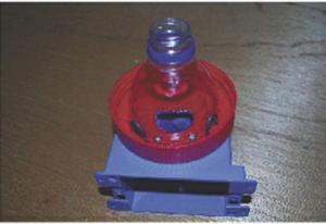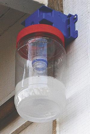 The trap is designed to screw in place over the wasp’s entrance/exit hole. It makes use of an ordinary plastic peanut butter jar, plastic pop bottle, and plastic electrical box. The upper part of the bottle is cut off to serve as a funnel. A large hole is cut into the peanut butter jar cover and then the cover is fastened to the electrical box. The funnel is held secure by two 5-in. long wires bent into a U shape and inserted up through holes in both the cover and electrical box. The funnel is then taped in place.