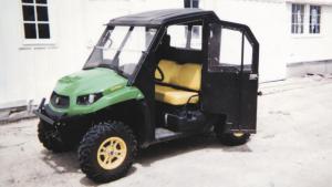 The lower part of the front windshield was a Deere accessory, and Viel made the upper part from Lexan. The windshield is supported by a center divider that mounts to the roll cage on top and to the cup holder on the bottom.