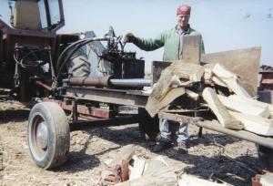“We mounted the reservoir tank on the rear half of an old wagon with an 8-in. I-beam for the splitter and put the hydraulic control on top of the tank,” he explains. “The hydraulic pump from the truck is operated by the pto of the tractor. The cylinder we used has a 22-in. long stroke and 6-in. dia.”