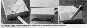 The drive-over grate is made of 2 in. pipe and has a load-capacity of 30,000 lbs., enough to support a legally loaded semi, the manufacturer points out. To keep rain or snow out, a tarp should be used. There are 4 small holes in the bottom of the hopper to let water drain out in case it rains or snows when the tarp isn't in place. The Port-A-Pit costs $1,995, complete with the grate and stub auger (but not including a motor on the auger). Without the auger, it sells for $400 less. For more information, contact: FARM SHOW Followup, Lee Welding Co., P.O. Box 81, Lee, Ill. 60530 (ph. 815 824-2264).