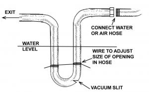 He cuts a slit diagonally 2/3 of the way through a hose, then bends the hose and lays it down into the water to be siphoned. A wire is used to adjust the bend in the hose so the slit stays open enough to create vacuum. Then he pumps either water or air through the hose, which creates a venturi effect to suck water in through the slit.