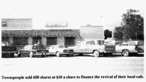 But within weeks, the townspeople banded together to set up a corporation and establish a new cafe, the Breckinridge County Cafe. They sold 600 shares at $50 a share to more than 60 stockholders and now have over $75,000 in financing. They also secured a bank loan for $45,000 guaranteed by the Small Business Administration.