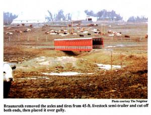"It keeps cattle from having to walk through mud all the time to go across the gully," says Gilbert Braunsroth. "The trailer is 8 ft. wide but only 6 ft. high so a tractor won't fit through it. This is the second livestock semi-trailer we've used in this location. The other one lasted for 15 years."