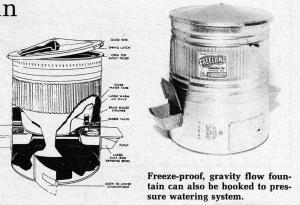 "The gravity flow fountain won't freeze due to its inside heat circulation," explains Lynn VanEpps, sales manager. "Warm air circulates through the large insulating dead air space passing entirely around the inner can, which is heated by an electric thermostatically controlled