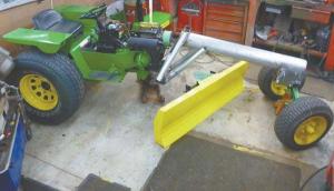 The small-size “Deere” wheel grader shown here started life as a Wheelhorse garden tractor without a mower deck. Campbell first cut off the front axle and then extended the frame 6 ft. using 6-in. dia. thin-wall tubing for the grader frame. He installed taller tires on the front and back, welding 5-bolt spindles on the front and reworking the fenders on back to clear the 30-in. tires. He made the 6-ft. wide grader blade and pivot plate out of 18-ga. sheet metal so it’s easy to raise and lower with a lever. Campbell says the grader was built just for show but could easily be modified to function as a working grader, if desired.