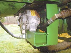 McPhail got a pump from Prince Manufacturing (ph 605 235-1220; www.princehyd.com). He fabricated a bracket for the pump and secured it to 4 existing holes on front of the transmission.