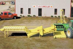 He says all components on his unroller are standard off-the-shelf parts. You can use any commercial square baler with the unroller. It takes 3 people to run the unroller at full capacity. One person with a front-end loader puts bales onto the machine and cuts the twine off.