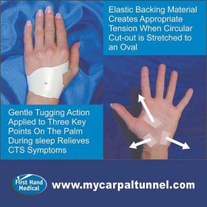in their fingers and a weak grip. Usually, they can’t sleep. Often they are scheduled for surgery. They try the Carpal Solution and within a few weeks, they feel relief and cancel the surgery,” says Karen, Customer Service Manager at First Hand Medical. A doctor invented the device working with patients. The Carpal Solution is a comfortable stretching brace that you put on your hand before retiring to bed and take off in the morning. The brace applies consistent gentle stretching action at three key points. It restores flexibility and circulation and relieves the pressure on the nerve.
