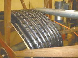 The new hose cutting machine is belt and chain-driven and uses a knife blade inserted into a specially machined pipe to make the cuts.