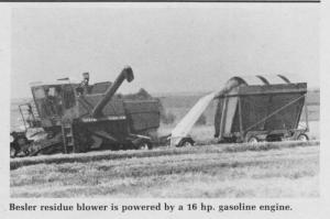 The 10 by 36 in. discharge spout is adjustable for directing the flow of residue into conventional forage wagons. "Thanks to the self-contained Residue Blower, your total investment for ætooling up' to salvage low-cost cattle feed is less since you don't have to mount anything on your combine, and you collect and haul the residue in the forage wagon you already own," explains Besler.