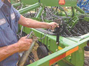 “Our greasing system eliminates getting down and crawling under the seeder to grease every port,” he says. “It cuts greasing time from an hour and a half or more to 10 to 15 min.”