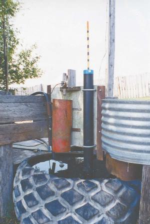 He uses it in a big rubber tire tank located next to a wooden fence. It consists of a float made from an empty 40-oz. plastic (or glass) bottle with a 1/2-in. dia. wooden dowel attached to it, which rides up or down inside a 5-in. dia. plastic pipe that’s U-bolted to a wooden board. The dowel fits through a plastic cap on top of the pipe, which keeps the dowel running straight up and down.