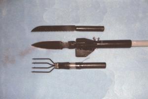 Nesbitt has also developed a wilderness survival kit for use with the stick. The kit includes a 4-prong fish spear, a 6-in. saw blade, and a 3 1/2-in. lance/knife blade tip.