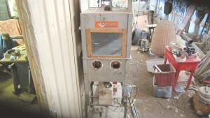 Gass uses the sandblaster a couple times a week to clean parts for cash registers that he’s restoring or removing chrome from pot bellied stoves that he’s fixing. He uses silica sand on some parts and soda ash for others. Most of the sandblasting he does requires 160 to 170 lbs. of air pressure which he gets from a commercial compressor in his shop.