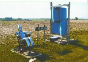 I built this wind-powered rocking “tin man” for a roadside display. The windmill, on the right, is made from plastic barrels cut in half and mounted on a vertical shaft. It drives a horizontal drive shaft that runs over to the tin man’s rocking chair. He looks quite content sitting there. (Louie Waelti, N3337 Aebly Road, Monroe, Wis. 53566)