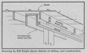 The sliding roof is divided into two sections with a slight overlap where the two sections meet to keep out rain and snow. The roof is supported by five massive stationary box rafters to which the metal track is fastened. These rafters extend beyond the building, almost to the ground.