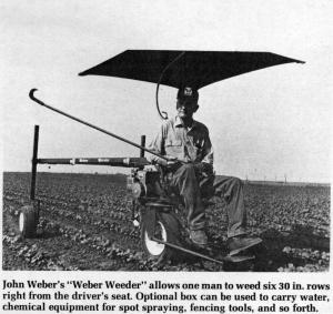 Weber has sold a number of machines to farmers who, because of health or leg problems, couldn't be in the field if it wasn't for a machine like his. "Now they're riding up and down fields all day long, and going all over the farm to check fences and crops, without violating doctor's orders not to do any walking," Weber points out.