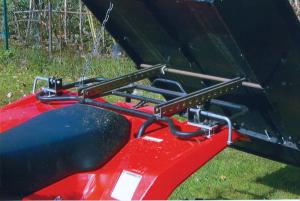 The dump box measures 3 1/2 ft. long and 2 1/2 ft. wide and has 1-ft. high sides. It mounts on a pair of rails bolted to the ATV’s rear cargo rack.