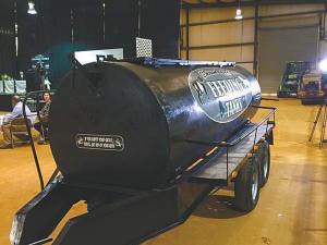 He built his prototype from scrap iron and metal at his farm, then used new materials for succeeding designs. The model he plans to use for production has a sturdy frame made of channel iron, dual wheels and an operator platform so small amounts of feed ingredients can be added from bags or pails. The discharge folds flush to the surface of the tank for easy transport.