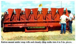 The stalk chopper, which fits 6 and 8-row, 30-in. corn heads, can be adjusted to either spread or windrow stalks. The knives mount under the snap rolls and cleanly chop stalks into 4 to 5-in. pieces.