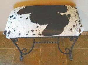 Reid has since re-covered the seats of several benches, bar stools, and chairs using various cowhide patterns for the upholstery. She buys her hides from various sources she finds on the internet and finds the old chair and bench frames at garage sales, antique stores and estate sales. She’s also made covers for new stools and benches. “Most of the old things I find are in tough shape. The frames are fairly unsteady, need new paint or stain and a new seat. I try to pick out pieces that will look good re-finished in a rustic or western theme. The metal frame pieces are often rusty and sometimes bent.”